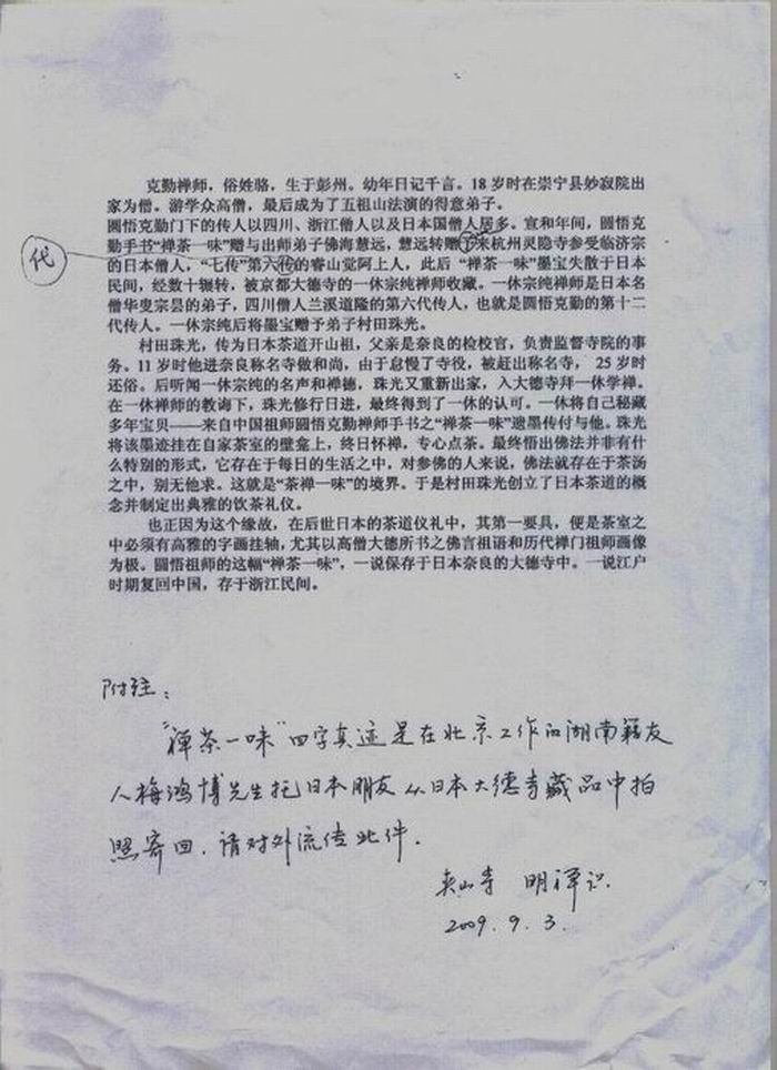 此类资料尚多、恕不一一赘引。目前国内外不少研究茶禅文化的著作,也都涉及到这段历史。纵览史料,同中有异:"同"在珠光得圆悟"墨宝真迹"而悟"茶禅一味",圆悟墨宝实为日本茶道之发韧;"异"在"墨宝"究为何物?是印可证书,是4字真诀,抑二者皆有,各论家所据不同?......总之,这是一个可以进一步考证的问题。
